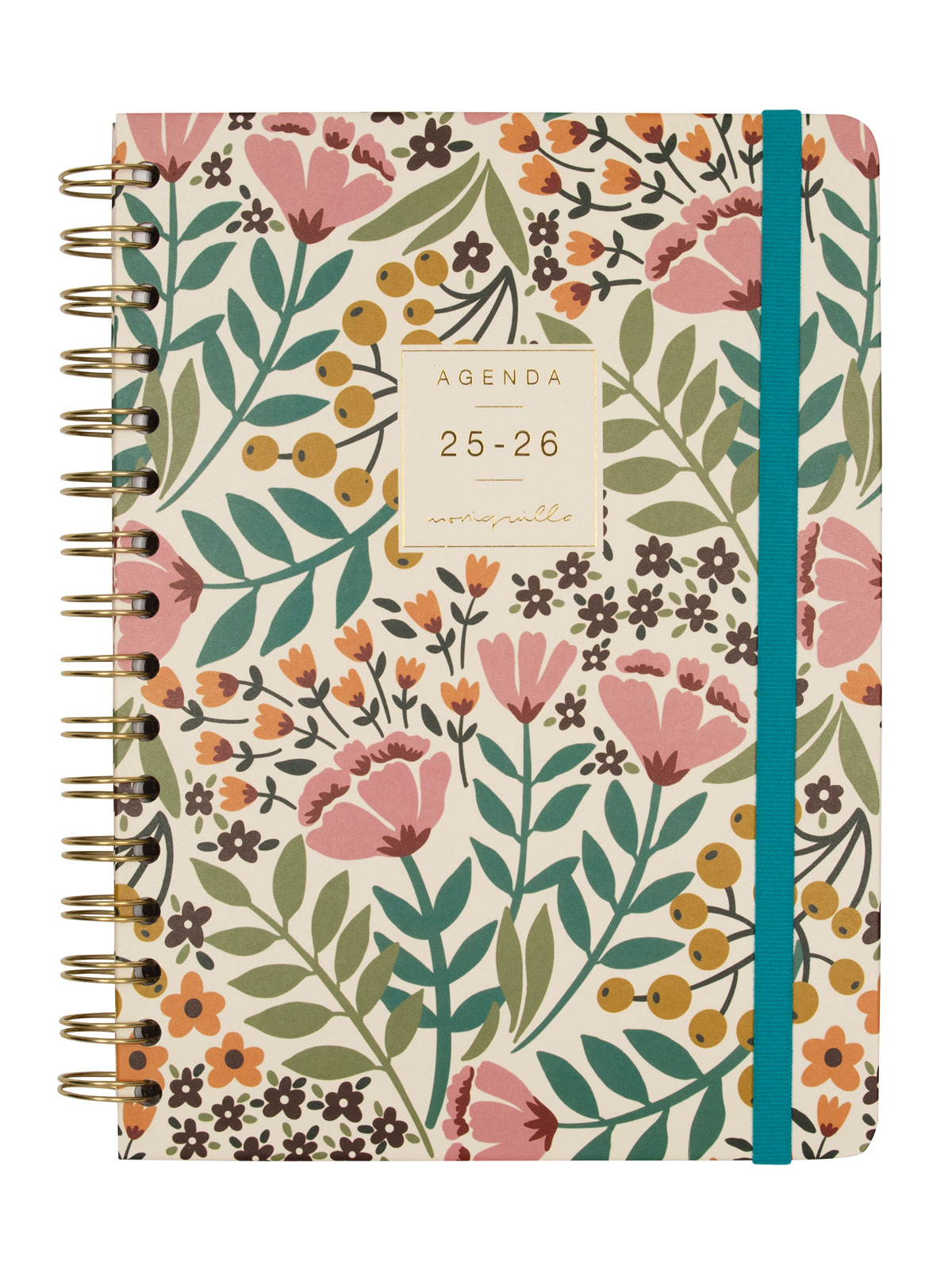Agenda de tapa dura de cartró folrat amb pel·liculat mat antiratllades. Amb espiral doble, goma elàstica i cantonades microperforades per localitzar ràpidament el dia/setmana en curs. Aquesta agenda s'ha creat en col·laboració amb la dissenyadora i il·lustradora Moniquilla, obtenint unes agendes boniques i funcionals. Amb una estètica neta i minimalista, s'ha concebut per acompanyar estudiants i adults de setembre a agost. Conté informació d'interès a l'anualitat i altres continguts extra. I, a més, dos marcapàgines i d'adhesius temàtics orientats a l'organització personal.