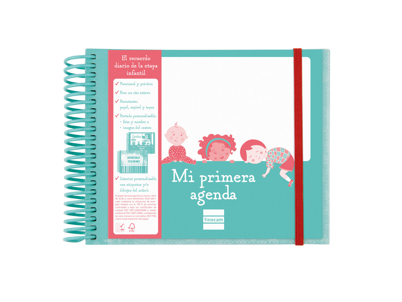 Agenda infantil d'espiral de plàstic pel control diari dels nens/es en l'etapa d'educació infantil. Per a llar d'infants i per a pàrvuls. Les tapes de polipropilè permeten la personalització de la portada per part dels pares o del centre educatiu amb la foto del nen/a. Cada pàgina incorpora un camp lliure per anotar-hi la data. Amb cantonades microperforades per localitzar ràpidament el dia en curs. Espiral de plàstic per evitar que l'infant es faci mal. Goma elàstica per evitar que els fulls que s'hi puguin afegir es perdin o que se n'arruguin les pàgines.