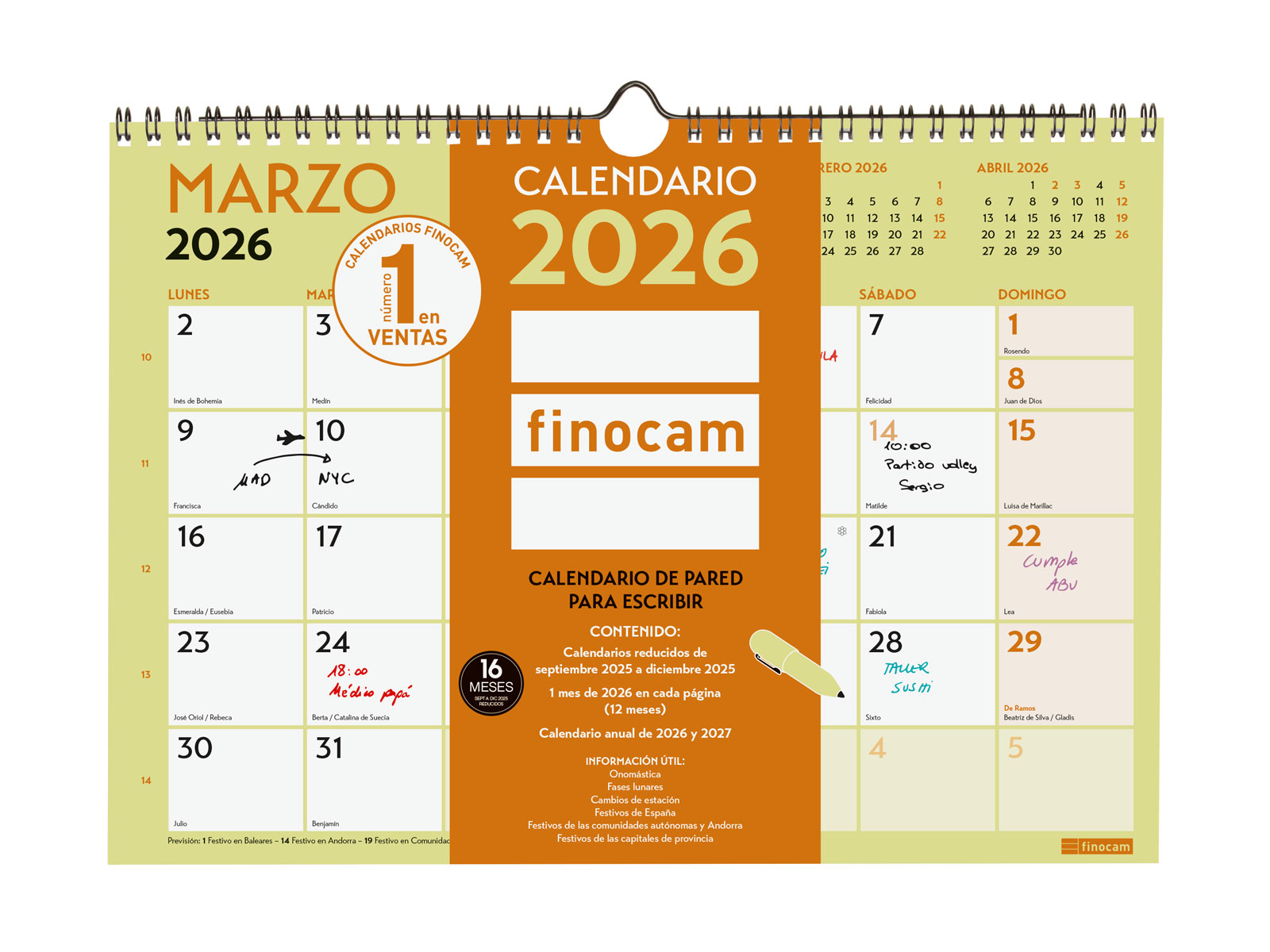 Calendari anual de paret a tot color enquadernat amb espiral doble i amb penjador. Amb un toc modern per aportar un ambient casual a la teva organització. Conté informació útil i d'interés, espai diari per anotacions i amb el mes anterior i posterior de cada pàgina. Perfecte per planificar els teus dies. Ideal per a l'oficina o la llar.