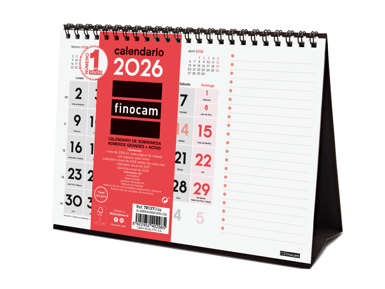 Calendari anual de sobretaula enquadernat amb espiral doble. Amb números grans i apartat a cada mes per la planificació de tasques, anotació de recordatoris, etc. Conté informació útil i d'interès i mes anterior i posterior a cada pàgina. Ideal per a la llar, l'oficina o sales de reunions.