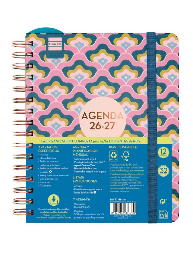 Agenda orientada a la gestió docent, amb disseny actual i modern. Tapes de cartró folrat amb estampats metal·litzats. Amb espiral doble metàl·lica, goma elàstica i regle punt. Ara amb paper reciclat de qualitat: la tinta no transparenta ni traspassa. Disposa d'apartats específics per adaptar-se a qualsevol especialitat del món educatiu: professors, mestres, coachs, tutors, educadors, etc. Agenda de setembre a agost amb informació d'interès a l'anualitat. Les cantonades són microperforades per localitzar ràpidament el dia/setmana en curs. Des del web Finocam podràs descarregar i imprimir: plantilles per a llistes, calendari del curs, planning mensual del curs, plantilles de checklist, full de recordatoris i altres elements més. Descobreix-los!