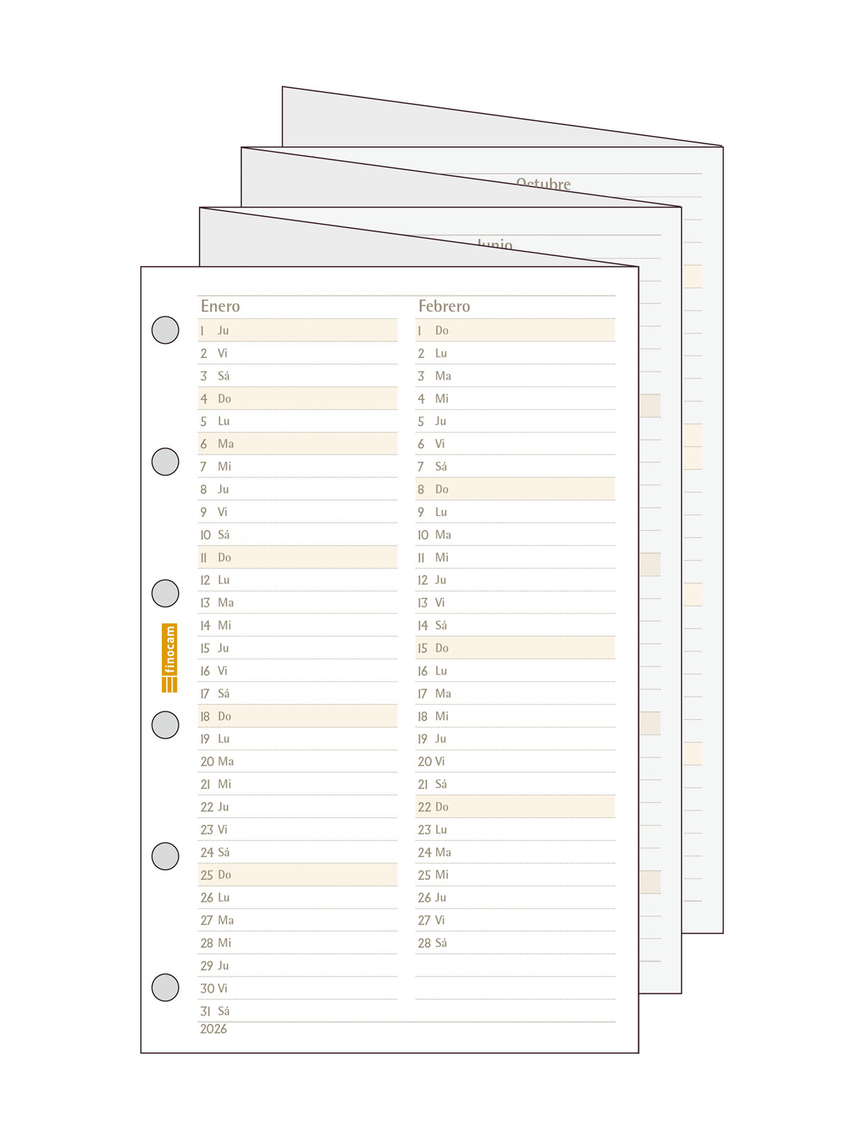 Recanvi anual extensible per a agendes d'anelles Finocam Classic. Visió completa de l'any desplegat en dos semestres: de gener a juny al davant, de juliol a desembre al darrere. Ideal per a les tasques de la planificació de l'any. L'anualitat conté els festius nacionals.