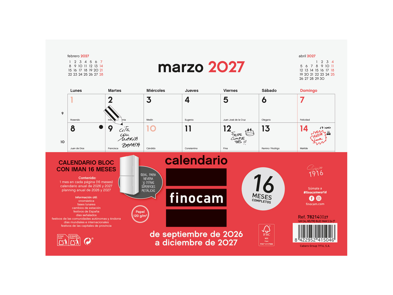 Calendario con imán de 16 meses: inicio en septiembre de 2026 y finalización en diciembre de 2027. Con espacio diario para anotaciones. Perfecto para planificar desde la vuelta de las vacaciones de verano todo el curso escolar y el año natural. Equipado con un imán para ser adherido en superficies metálicas como la nevera, el bastidor del escritorio o pizarras metálicas. Encolado en la parte superior para arrancar cada mes la página. Con mes anterior y posterior en cada página. Calendario con información útil y de interés. Ideal para la planificación de adultos y estudiantes, o para disponerlo en espacios compartidos y organizarse familias y unidades de convivencia.