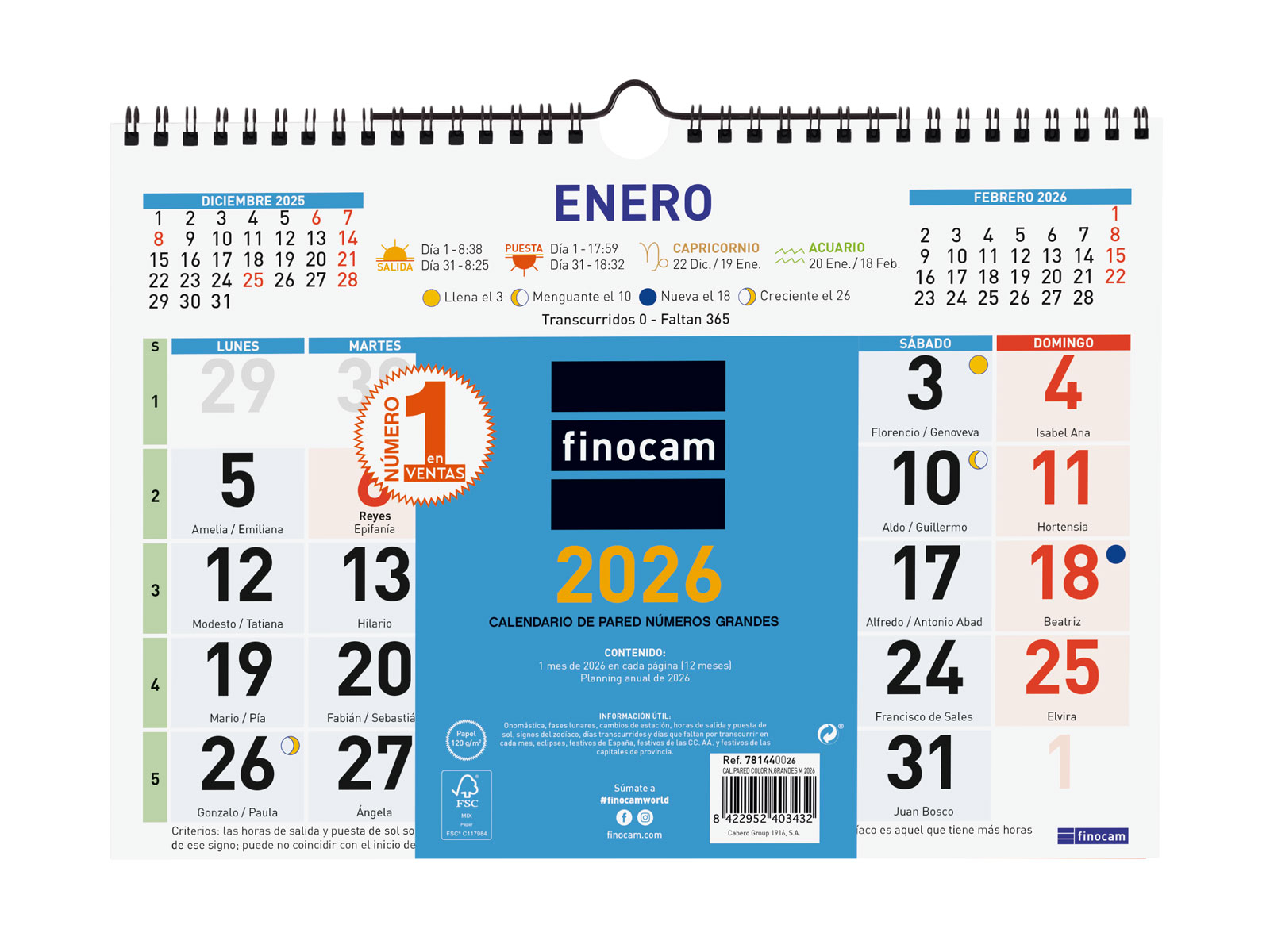 Calendario anual de pared con números grandes para una visión rápida del mes. Encuadernado con espiral doble y con colgador. Incluye las informaciones relevantes del mes, mes anterior y posterior en cada página y otros contenidos extra. Ideal para el hogar o para la oficina.